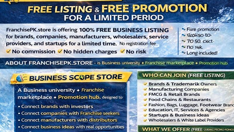 franchisepk.store – LIMITED TIME FREE LISTING OFFER Expand Your Business Nationwide at Zero Marketing Cost In today’s competitive market, business growth is not limited by product quality — it is limited by visibility, reach, and the right connections.franchisepk.store is Pakistan’s dedicated platform built to solve exactly this problem. For a limited time, we are offering … Continue reading LIMITED TIME FREE LISTING OFFER WITH FRANCHISEPK.STORE